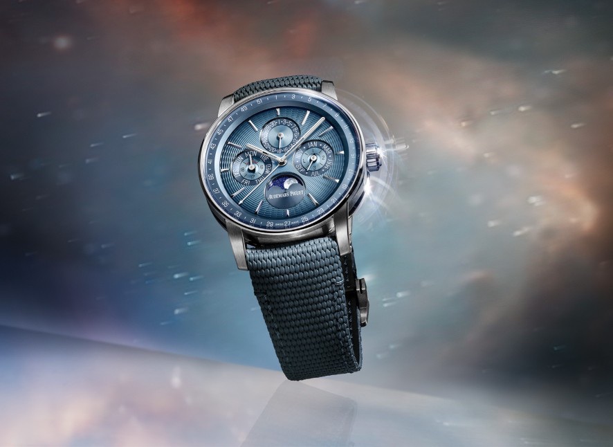 è stato sviluppato sulla base tempo automatica, calibro 7121, aggiornamento introdotto nel Royal Oak “Jumbo”, ref. 16202 del 2022: l’indizio più evidente sono i ponti passanti sul bilanciere e sul bariletto, realizzati in oro rosa a 22 carati, così come il rotore scheletrato. Nel dettaglio, con i suoi 29,6 mm di diametro e 4,1 mm di spessore, il calibro 7138 è solo 0,6 mm più largo del suo predecessore 5134, ma 0,4 mm più sottile: funziona a 28.800 alternanze/ora rispetto alle 19.800 del 5134, con 15 ore di riserva di carica in più (55 ore in totale). Diversamente, invece, dal calibro 5133, sul 7138, le correzioni della corona formano un secondo livello che permette, comunque, al movimento di mantenere, come detto, un profilo sottile, alto 4,1 mm. Al top le finiture: Côtes de Genève, spazzolatura satinata, venatura circolare, la satinatura, la finitura colimaçonnage e la smussatura, tutte visibili sul lato del fondello. Passando al quadrante, le indicazioni perpetuali sono state riorganizzate per migliorare la leggibilità, la simmetria e l’armonia estetica. Le fasi lunari sono sempre al 6, ma la luna piena (disegnata riproducendo fedelmente una fotografia della NASA) è ora centrata sull’asse delle ore 12; giorno della settimana al 9, data al 12 e mese al 3 riflettono una visualizzazione che il brand definisce “europea” del calendario. E, poi, l’indicazione della settimana sul rehaut è stata leggermente ruotata in senso antiorario di un’unità. Completano il quadro il ciclo bisestile all’interno del contatore, al 3, e l’indicatore 24 ore, al 9, con, in evidenza, la “zona di non correzione” stampata in rosso tra le 21 e le 3 (comunque, non c’è il rischio di danneggiare il movimento durante il processo). Il nuovo movimento è stato presentato all’interno del Royal Oak e del Code 11.59 by Audemars Piguet, il primo, da 41 mm (9,5 mm di spessore) declinato in acciaio e in oro sabbiato – quadranti “Grande Tapisserie” blu e ton sur ton -, mentre il secondo, in oro bianco dal medesimo diametro, è alto 10,6 mm, con caratteristico quadrante in rilievo nelle sfumature del blu fumé: il motivo è composto da cerchi concentrici che si estendono dal centro ed è decorato con centinaia di piccoli intagli che conferiscono luce e profondità.