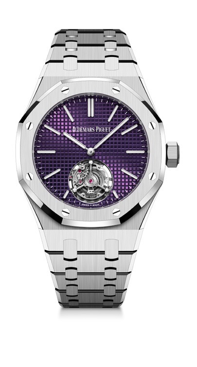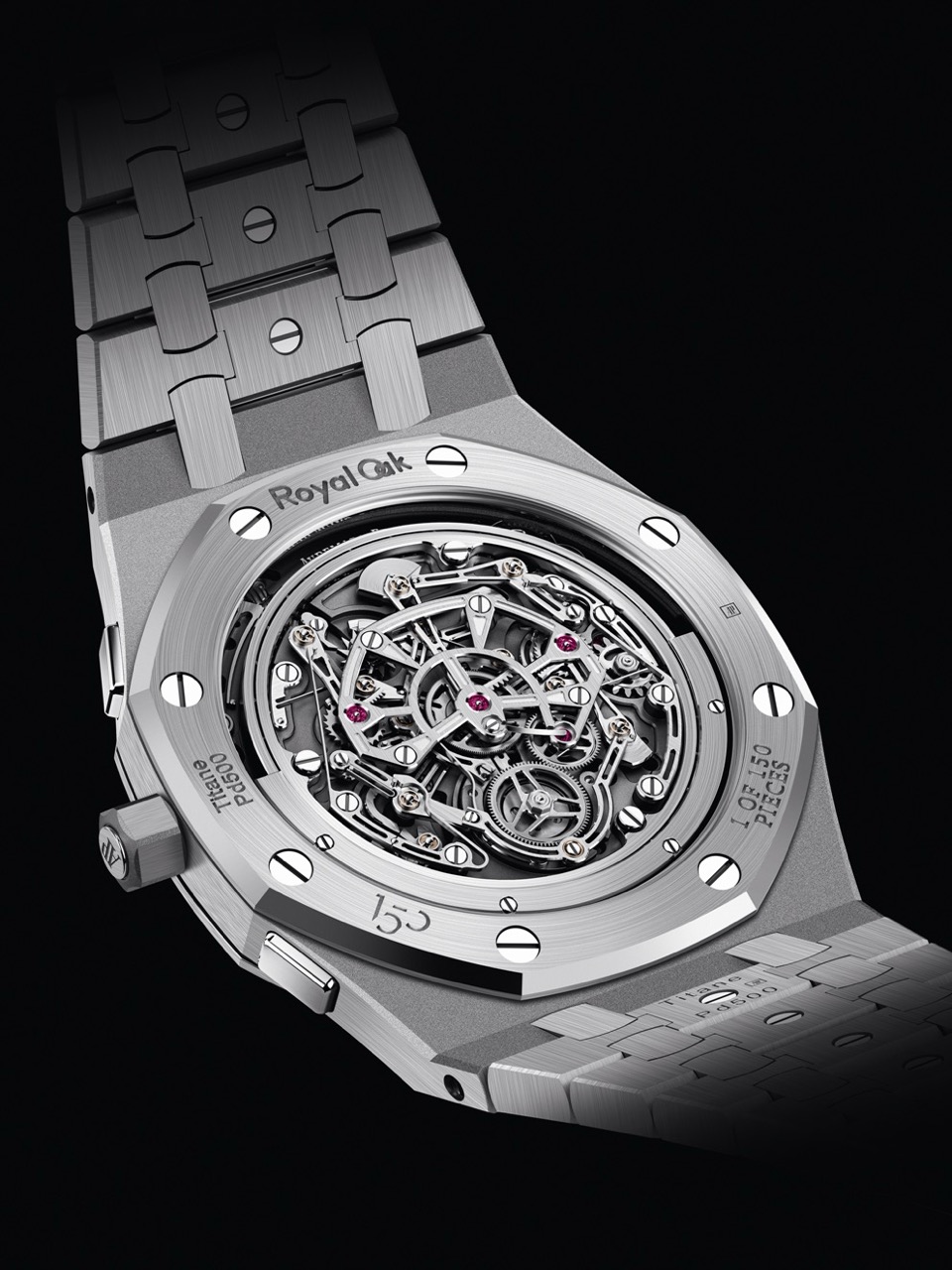 Royal Oak “Jumbo” Flying Tourbillon Cronografo Automatico Extra-Piatto RD#5, in titanio (carrure e corona) e Bulk Metallic Glass (lunetta, pulsanti, fondello e selettore di funzione), da 39 mm (spessore di 8,1 mm), vetro zaffiro antiriflesso, pulsanti di forma, fondello integrato da vetro zaffiro. Impermeabile fino a 2 atmosfere. Quadrante “Bleu Nuit, Nuage 5.0”, Petite Tapisserie, indici “baignoire” in oro rosa rodiati e lancette a bastone in oro bianco luminescenti, tourbillon volante al 6, contatori (ore crono al 3 e minuti crono al 9) con fondo rifinito a colimaçonnage. Movimento automatico di manifattura, calibro 8100, riserva di carica di 72 ore a crono avviato/80 ore a crono fermo. Bracciale in titanio e BMG, chiusura déployante in titanio.
