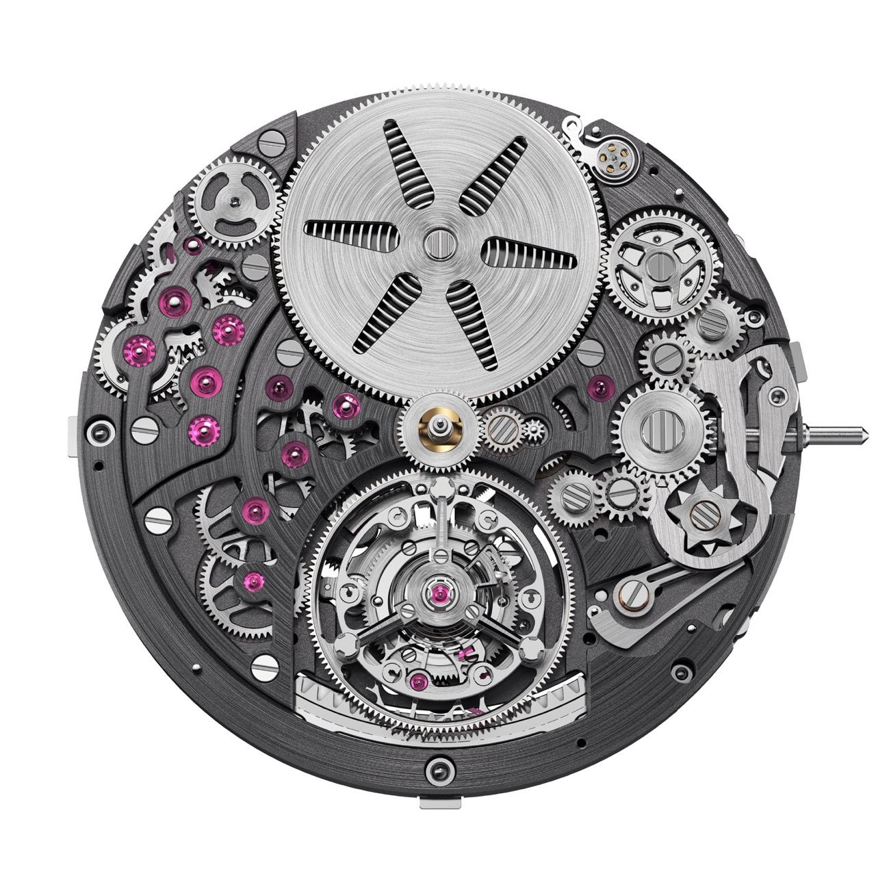 Il fronte posteriore del calibro 8100 è visibile attraverso il fondello integrato da vetro zaffiro ed è completamente a vista a motivo del posizionamento della massa oscillante periferica in platino. Caratteristiche generali: 31,4 mm di diametro (14’’’), 4 mm di spessore, 379 componenti, 44 rubini, bilanciere a regolazione inerziale oscillante a 21.600 alternanze/ora, riserva di carica di 72 ore (crono avviato)/80 ore (crono fermo). Ponti scheletrati.