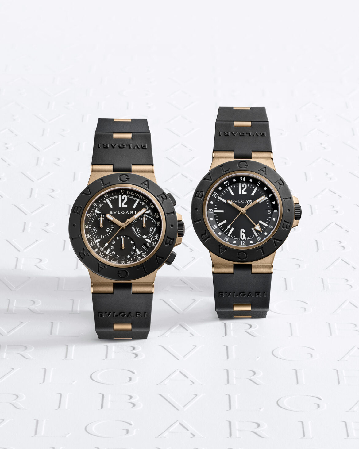Entrando nello specifico, i nuovi Bulgari Bronzo – su cassa sabbiata – sono stati declinati nel GMT (40 mm e 9,7 mm di spessore) e nel Cronografo (41 mm e 12,5 mm di altezza). Il design Aluminium, definito dal caucciù – sul cinturino a maglie mobili su cilindri in bronzo (integrato da originale sistema di chiusura in velcro) e sulla lunetta incisa Bvlgari Bvlgari -, è completato da corona, pulsanti (nel crono) e fondello in titanio sabbiato DLC nero, per un’impermeabilità fino a 10 atmosfere. Il contrasto bronze/black prosegue sul quadrante mat, percorso da sfere placcate in oro rosa sabbiato con effetti luminescenti, e da indici bianchi a barretta con l’immancabile numero arabo al 12 (e al 6 nel GMT). La scala 24 ore sul rehaut nel GMT e quella tachimetrica periferica sul crono, con i tre contatori dall’imprinting “racing”, caratterizzano i modelli animati, rispettivamente, dai calibri automatici B192 (28.800 alternanze/ora e 50 ore di autonomia) e B381 (42 ore di riserva di carica), entrambi su base Sellita, con il cronografo integrato da modulo Dubois-Dépraz.