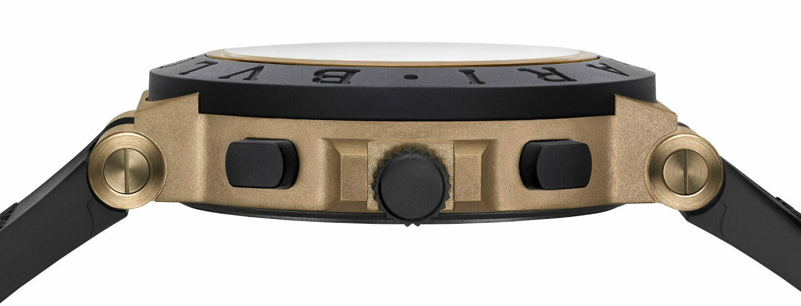 Bulgari Bronzo Chronograph, da 41 mm, in bronzo (spessore di 12,5 mm), lunetta in caucciù incisa “Bvlgari Bvlgari”, vetro zaffiro, corona zigrinata (con spallette di protezione)/pulsanti di forma/fondello in titanio sabbiato DLC nero. Impermeabilità fino a 10 atmosfere. Quadrante nero mat, lancette a bastone luminescenti, indici bianchi a barretta e numero arabo al 12, piccoli secondi al 3, ore crono al 6, minuti crono al 9, scala tachimetrica periferica, datario al 4/5. Calibro automatico B381, riserva di carica di 42 ore. Cinturino in caucciù con raccordi in bronzo, chiusura in velcro.