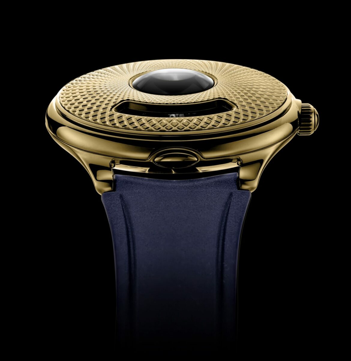 Versione in oro 3N del Time Jumper. Dall’immagine si evince il profilo della cassa a configurare un disco volante. Si può notare la lente a cupola al centro, l’apertura a semicerchio, al 6, per l’indicazione dei minuti e il guillochage della cuvette, il cui motivo, esclusivo di Czapek, si sviluppa “a vortice”, producendo l’illusione ottica di curve risucchiate verso il centro.