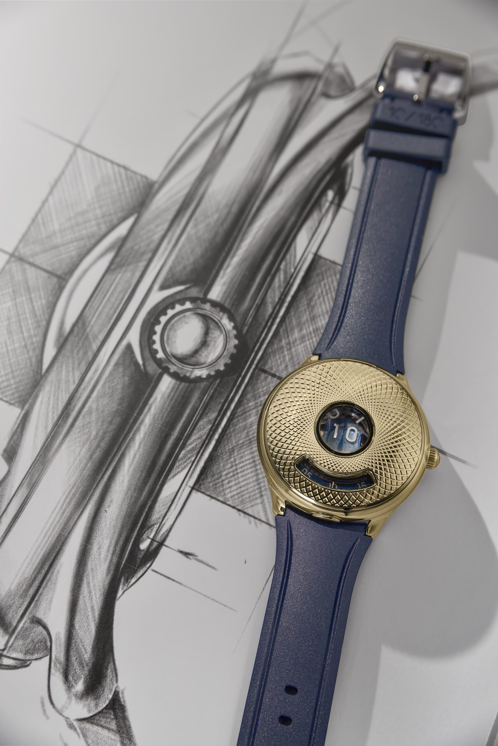 Time Jumper, in acciaio, da 40,5 mm (spessore di 12,35 mm), vetro zaffiro glassbox con trattamento antiriflesso, lunetta lucida, cuvette rifinita con motivo guilloché a vortice (lente a cupola al centro), pulsante al 6 per l’apertura della cuvette, fondello fissato da quattro viti e integrato da vetro zaffiro. Impermeabilità fino a 3 atmosfere. Quadrante a vista, disco delle ore e anello dei minuti colorati al laser in blu e testurizzati. Movimento automatico di manifattura, calibro 10.01, riserva di carica di 60 ore. Cinturino in caucciù blu, fibbia ad ardiglione in acciaio. Serie limitata a 100 esemplari.