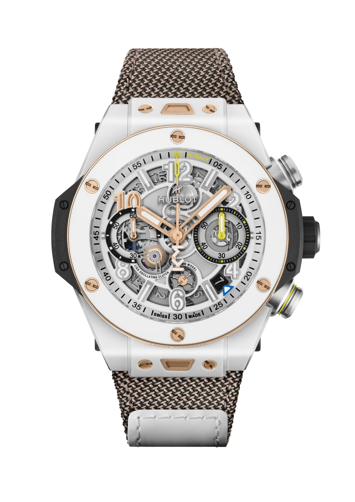 Big Bang Reloaded Kylian Mbappé, in ceramica bianca lucida micropallinata, da 44 mm (14,5 mm di spessore), lunetta in King Gold con anello superiore in ceramica bianca micropallinata fissato da sei viti in King Gold, fondello in ceramica bianca fissato da sei viti in King Gold. Quadrante scheletrato bianco, placcato grigio opaco, indice al “10” placcato King Gold, lancette a bastone placcate King Gold e luminescenti, sfera dei secondi crono con estremità scheletrata in giallo, tono ripreso sulla sfera dei minuti crono. Movimento automatico di manifattura, calibro UNICO “HUB 1280”. Cinturino in tessuto di colore King Gold, chiusura in Velcro e fibbia sportiva in ceramica bianca micropallinata. Serie limitata a 200 pezzi. Prezzo: 29.400 euro.