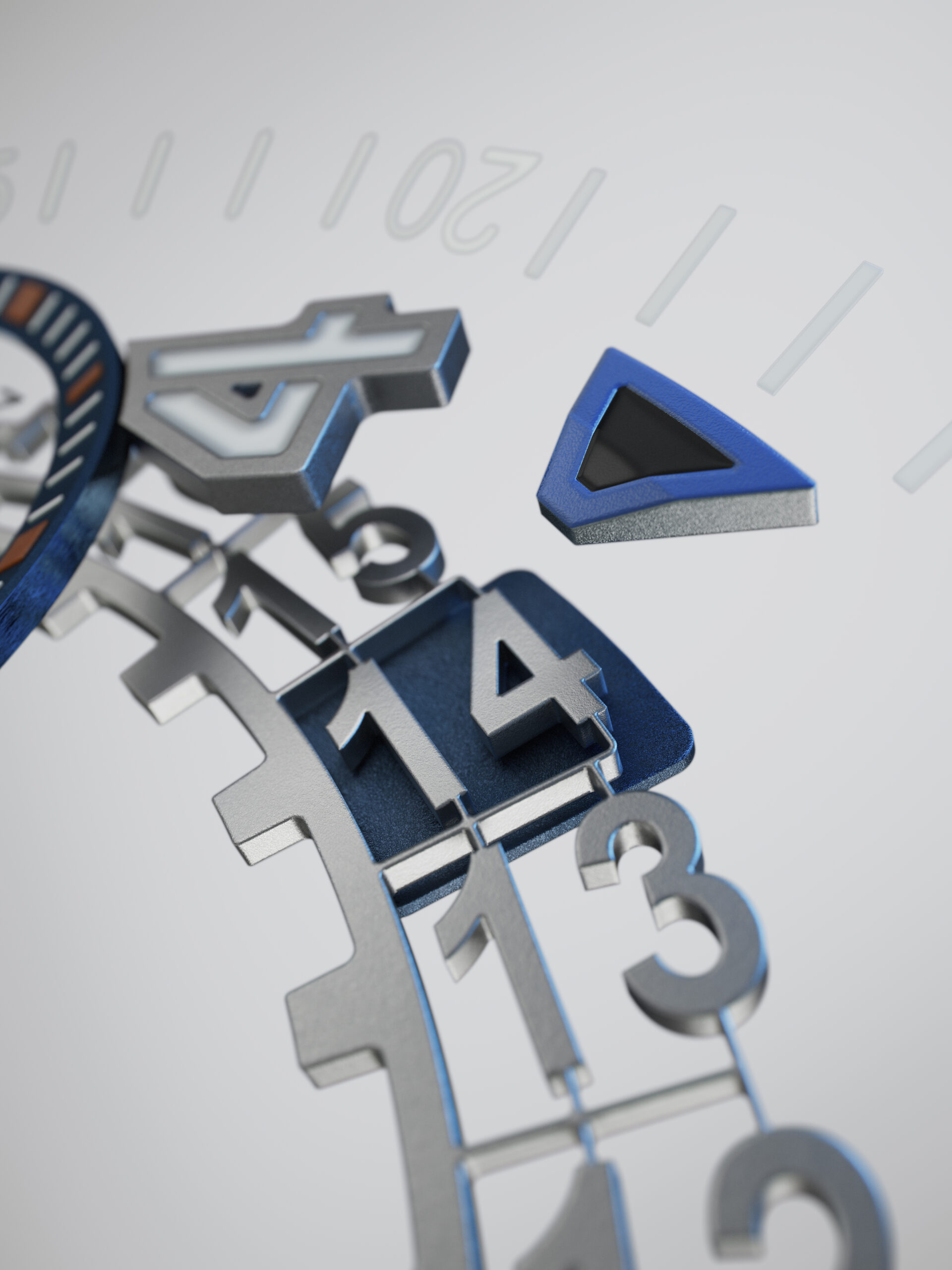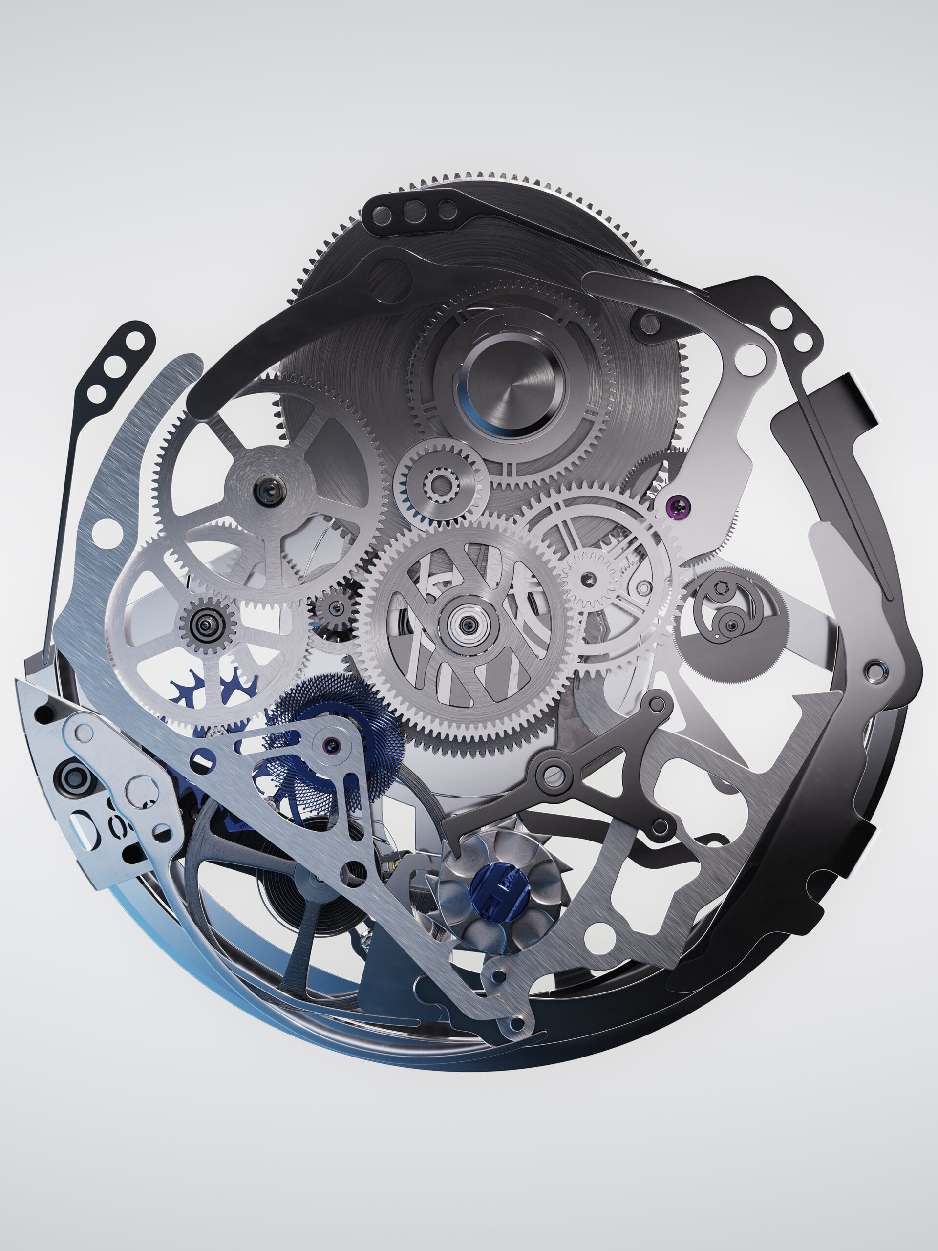 L’anello scheletrato del datario, visibile in trasparenza, trova la sua evidenza nella finestrella posta al 4/5, accompagnata da un piccolo indice a freccia azzurrato.