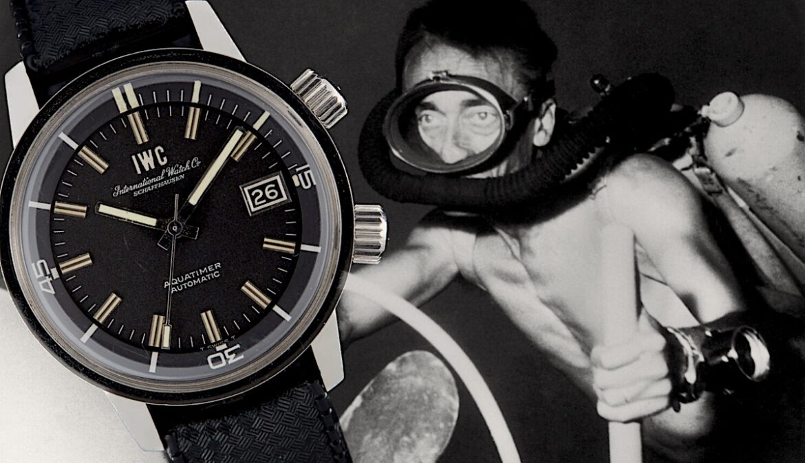 È il 1967. Gli sport acquatici vanno per la maggiore e molti cercano orologi robusti che possano garantire una certa resistenza, ma anche un’eccellente impermeabilità, oltre uno stile. In casa Rolex si realizzavano da anni i noti professionali Submariner, Ref.5512, decidendo d’indicare la profondità garantita in metri (200) prima dei “piedi” sul quadrante (di cui il ricercato modello “Meters First”), mentre in casa Blancpain viene promosso il modello Fifty Fathoms. Omega produce un esemplare molto competitivo e di qualità, il Seamaster, e ovunque “spuntano” diver che seguono la scia. È in questo quadro che la Maison di Sciaffusa, nota come International Watch Company, decide di progettare un segnatempo dalle linee abbastanza classiche, con una particolarità che segnerà il suo stile negli anni e delle buone caratteristiche sul piano tecnico. Sarà il capostipite di una famiglia di orologi professionali chiamati istintivamente Aquatimer.