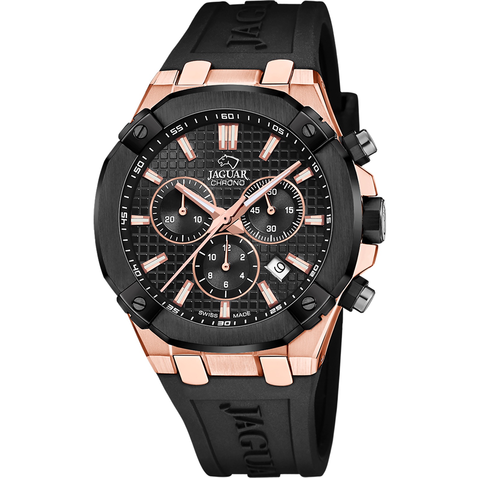 Jaguar, collezione Diplomatic (Swiss Made). Cronografo in acciaio placcato oro rosa da 44 mm, cassa tonneau e lunetta ottagonale PVD nero con quattro cavalieri avvitati, vetro zaffiro, corona con spallette di protezione e incassi dei pulsanti a pompa PVD nero, impermeabile fino a 10 atmosfere. Quadrante nero stampato guilloché (texture carré), contatori azurée, indici e lancette luminescenti placcati oro rosa, data al 4/5. Movimento al quarzo, calibro 5030D-4.5H1. Cinturino in caucciù nero. Prezzo: 550 euro
