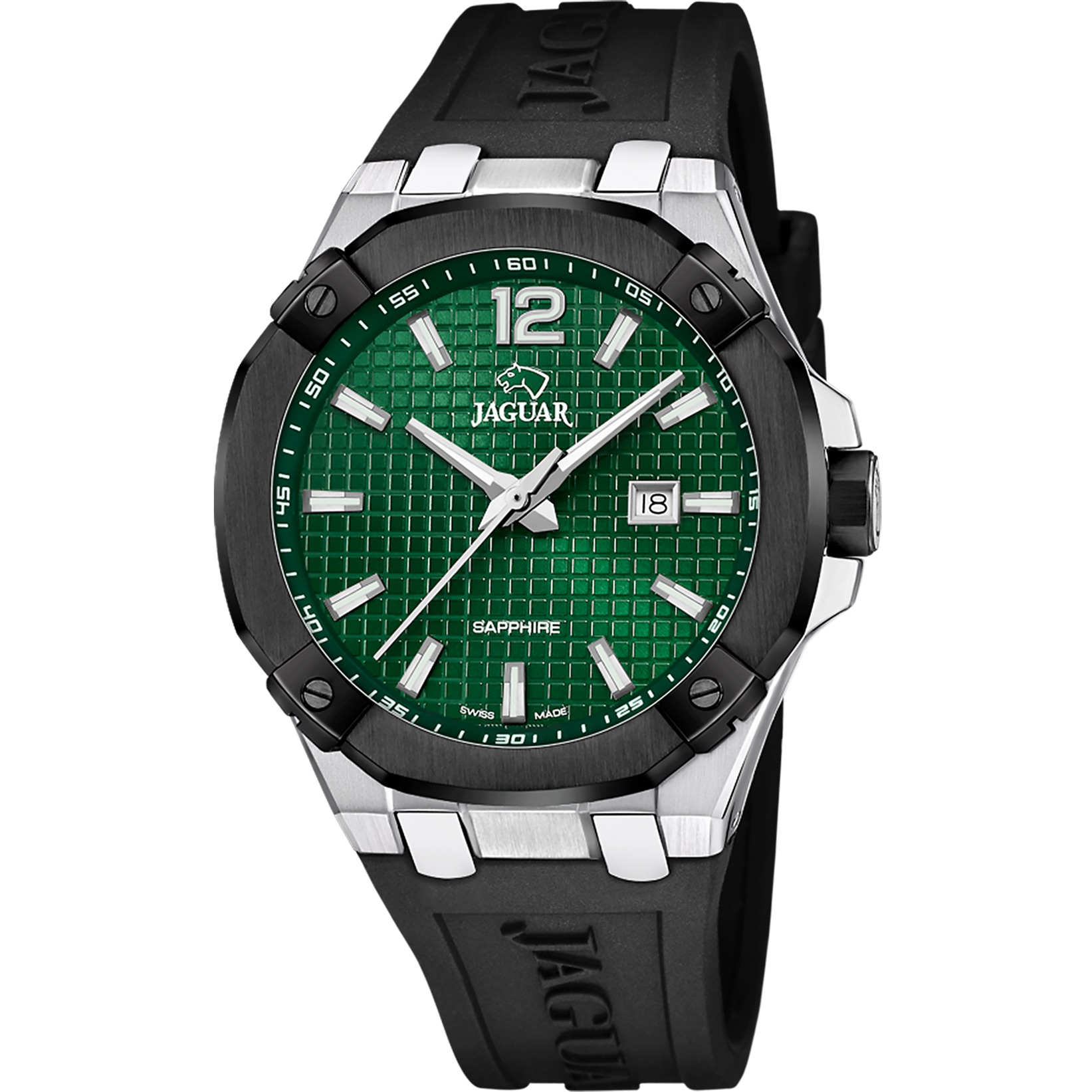Jaguar, collezione Diplomatic (Swiss Made). Modello in acciaio da 44 mm, lunetta ottagonale e corona PVD nero. Quadrante verde, indici (numero arabo al 12) e lancette luminescenti. Movimento al quarzo, calibro Ronda 705. Cinturino in caucciù nero. Prezzo: 425 euro
