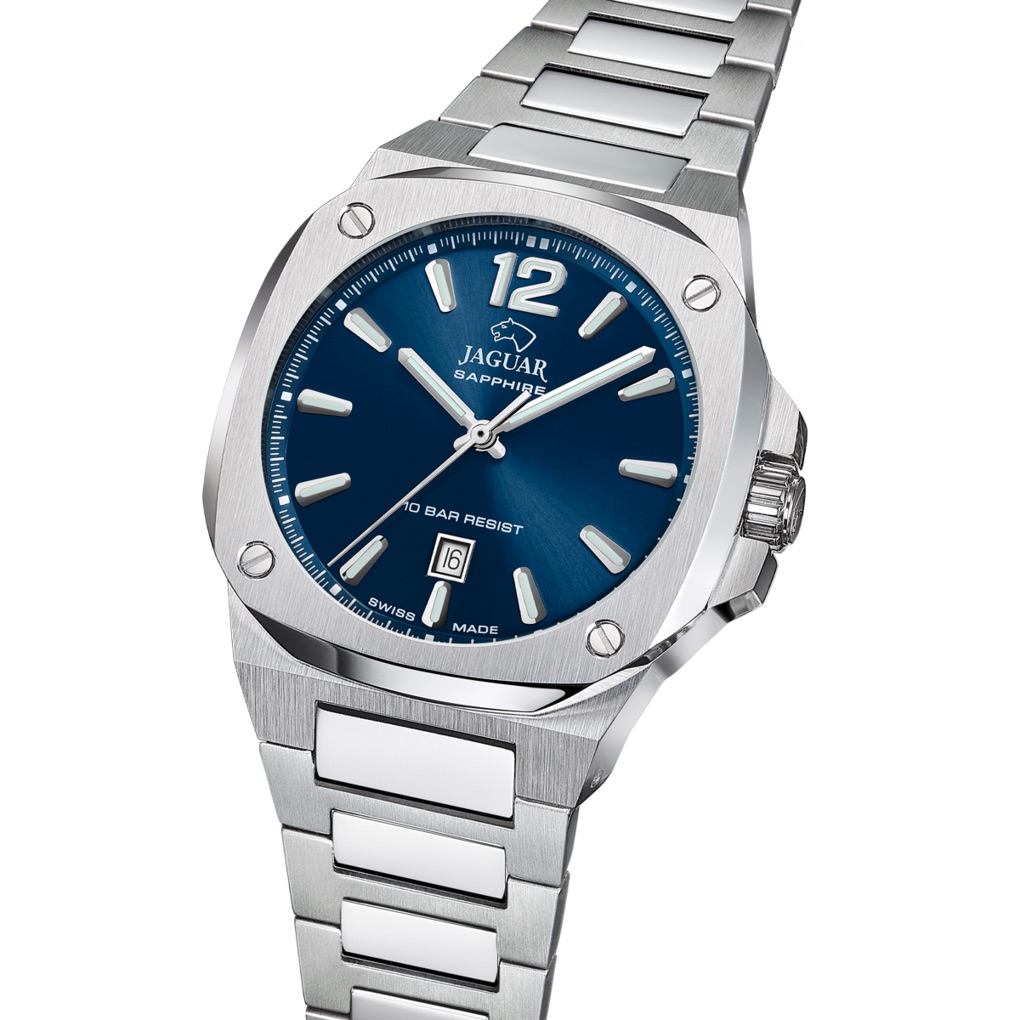 Jaguar, collezione RC (Swiss Made). Modello in acciaio da 41 mm, cassa tonneau e lunetta carré galbée con sfacci lucidi e quattro viti, vetro zaffiro con trattamento antiriflesso, corona con spallette di protezione, impermeabile fino a 10 atmosfere. Quadrante blu soleil, indici (numero arabo al 12) applicati e lancette luminescenti, data al 6. Movimento al quarzo, calibro Ronda 705. Bracciale integrato in acciaio. Prezzo: 350 euro