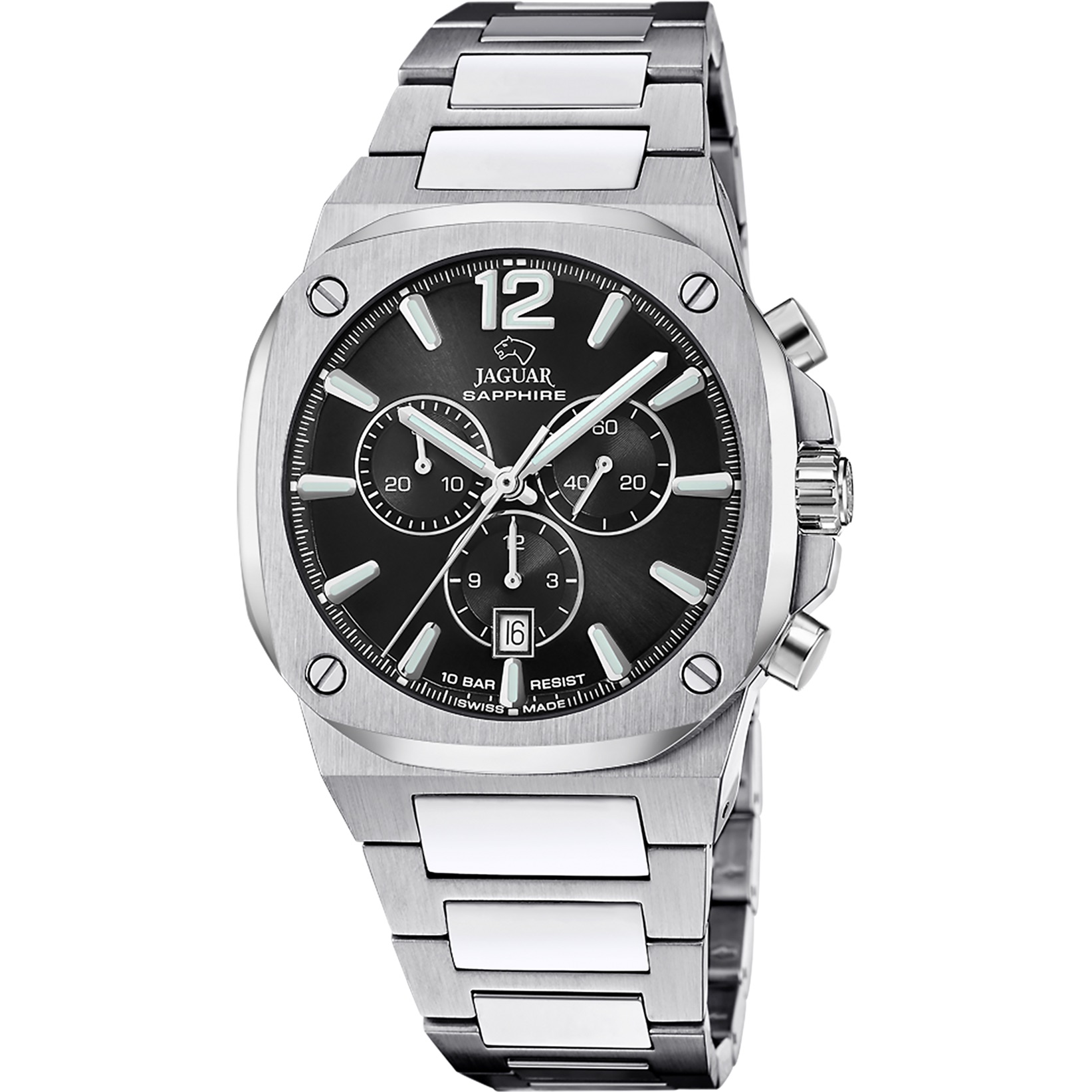 Jaguar, collezione RC (Swiss Made). Cronografo in acciaio da 42,9 mm, pulsanti a pompa. Quadrante nero soleil, contatori azurée. Movimento al quarzo, calibro Ronda 5030D-6H1. Bracciale integrato in acciaio. Prezzo: 550 euro