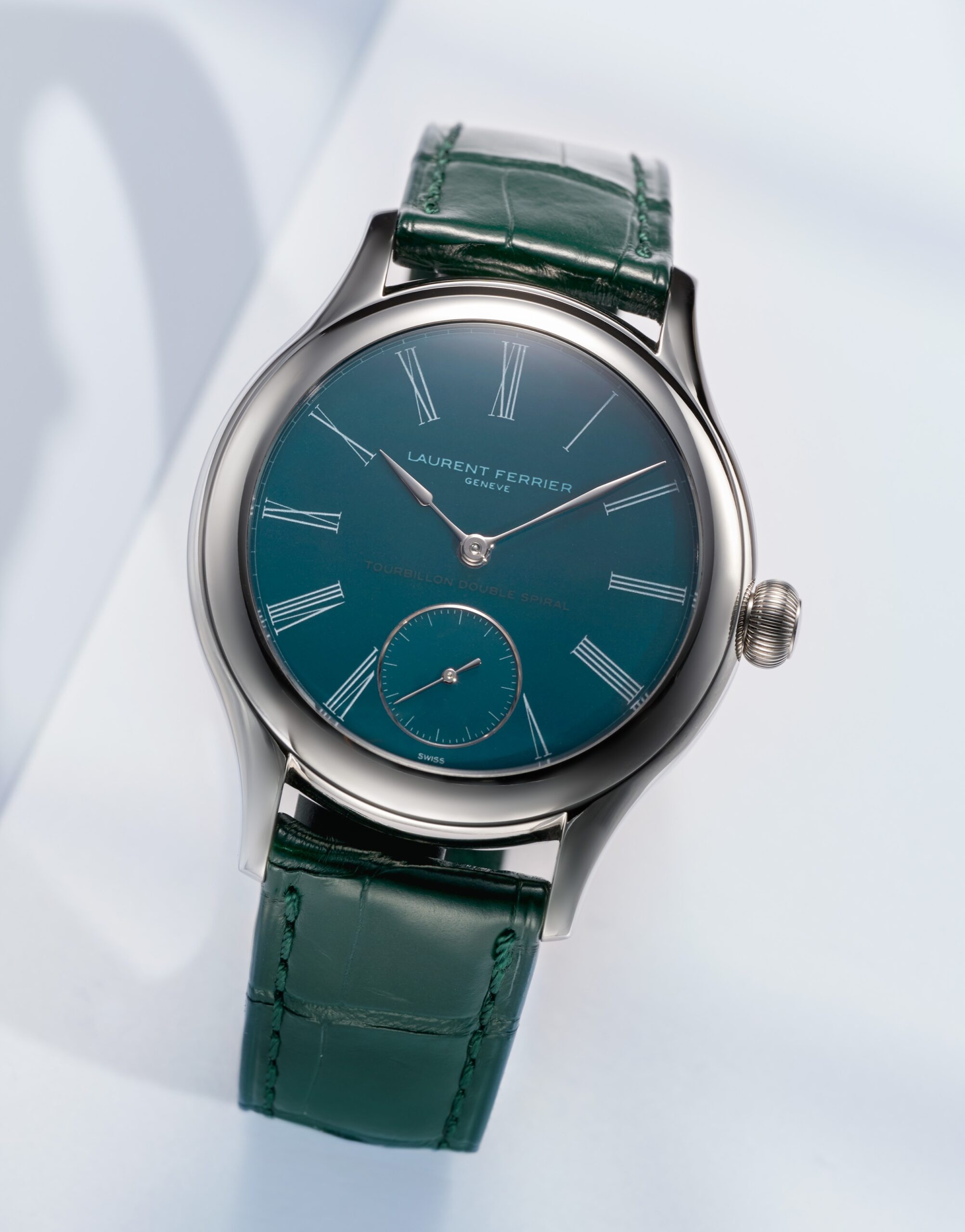 Inevitabile, dunque, per celebrare i 15 anni dal succitato, fortunato esordio “indipendente” nel salotto buono del segnatempo, proporre una nuova edizione, nel contesto della Série Atelier, del Classic Tourbillon con doppia spirale. Come ha sempre osservato Ferrier, quel modello sarebbe stato sconsigliato da qualsiasi esperto di marketing o pubbliche relazioni, per inaugurare la nascita di un nuovo brand: era veramente rischioso, infatti, proporre un solotempo con piccoli secondi dove il tourbillon fosse “nascosto” dietro ad un quadrante smaltato, rinunciando ad esplicitare la complicazione alla luce del sole. Semplicemente, l’obiettivo di Laurent era quello di creare un orologio che potesse essere ammirato da ogni angolo o prospettiva, delicato ed assolutamente discreto, nel rispetto di una profonda convinzione dell’autore: “Quando non rimane nulla da eliminare, la perfezione è raggiunta”. Ispirato dai tourbillon da tasca del XIX secolo, il nuovo Classic Tourbillon Teal – Série Atelier VII prevede, per la prima volta in “casa” Laurent Ferrier, una cassa in platino da 41 mm (12,5 mm di spessore), con anse dalla marcata sinuosità a rientrare, corona oignon zigrinata e lunetta bombata lucida, a configurare un impatto morbido e delicato al polso. Il quadrante, in oro bianco, è smaltato Grand Feu nell’accattivante tonalità del verde acqua. Su di esso, immancabile, seppur appena accennata (decalcata nella tonalità blu cielo), la scala della minuteria a chemin de fer, percorsa da sfere Assegai (richiamano la testa di una lancia africana), incornicia numeri romani allungati in smalto bianco; il quadro è completato dai piccoli secondi al 6 evidenziati da una circonferenza in oro bianco (la lancetta è calettata sul medesimo asse di rotazione del tourbillon, posizionato sul retro del meccanismo). Sopra di essa, “immersa” e appena visibile sul fondo smaltato – a simulare una firma segreta alla memoria di Breguet – ecco l’indicazione “Tourbillon Double Spiral”, una soluzione tecnica prevista dal calibro manuale LF619.01, da 14’’’ (31,6 mm di diametro e 5,57 mm di spessore), visibile fronte fondello, protetto da vetro zaffiro, e trattato, sui ponti, con una satinatura orizzontale: un tocco di contemporaneità rispetto al tradizionale Côtes de Genève adottato sulle precedenti versioni, mentre tutti i componenti, dai ruotismi al bilanciere a regolazione inerziale con viti di compensazione sono stati rodiati: ancora una “première” per la Maison.