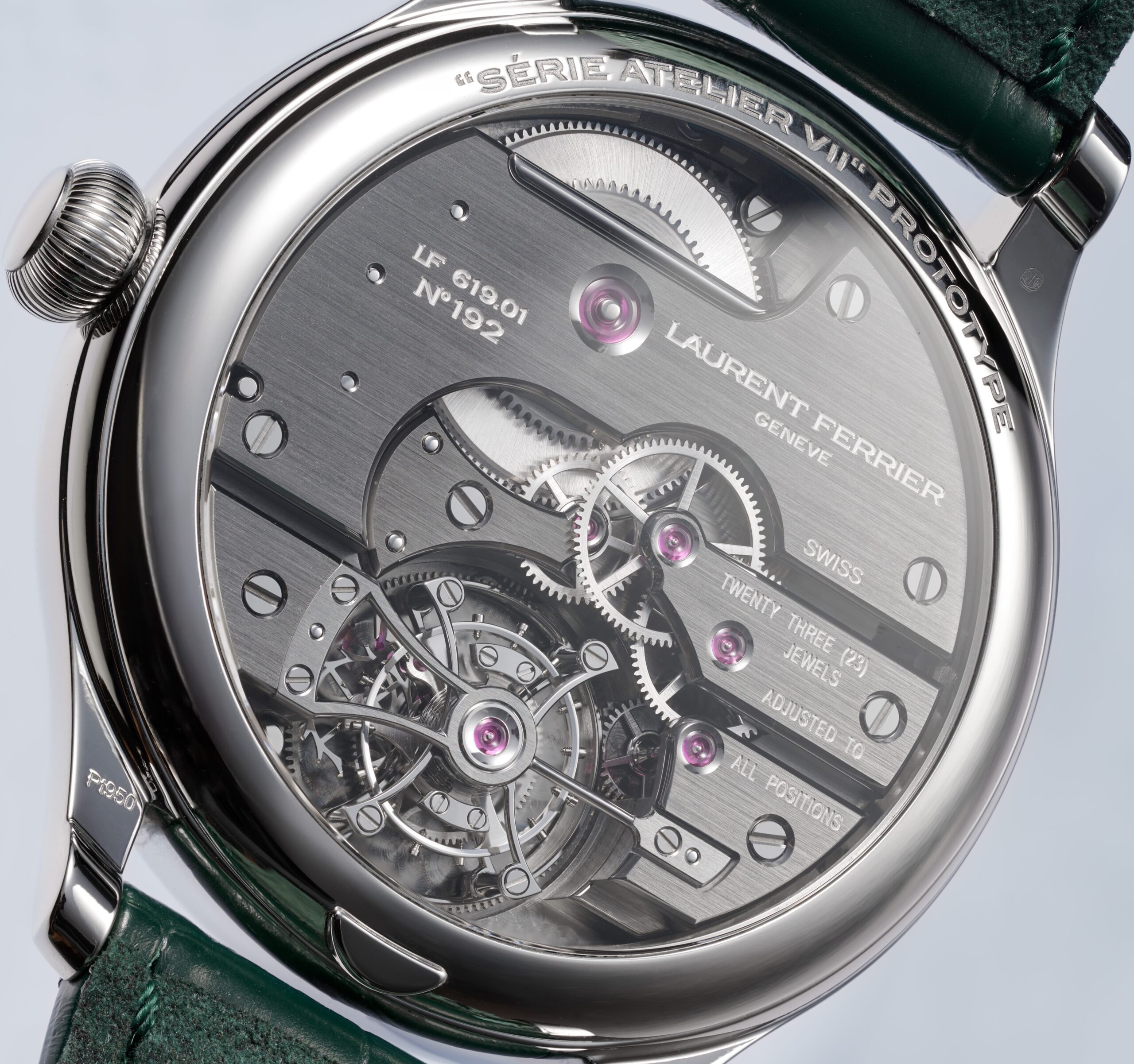 Al di là di questi particolari, si tratta del medesimo meccanismo impiegato 15 anni or sono. e svolge la sua funzione di opposizione alle distorsioni gravitazionali a “contatto” Protagonista assoluto, ovviamente, il tourbillon a 60 secondi, la cui gabbia fissata su di un ponte passante asimmetrico, scheletrato da un lato, presenta circa 30 angoli interni rifiniti a mano con il polso. L’efficacia in termini di precisione del tourbillon è ulteriormente accresciuta da una doppia spirale montata in opposizione, ad equipaggiare un bilanciere oscillante a 21.600 alternanze/ora, e finalizzata a neutralizzare il naturale spostamento laterale del suo asse: il risultato, assimilabile ma più funzionale rispetto alla curvatura della singola spirale, permette una maggiore operatività concentrica ed una migliore capacità di risposta alle forze di richiamo della doppia spirale con conseguente, positivo effetto sulle potenziali variazioni nell’ampiezza delle oscillazioni del bilanciere. Un plus simile va unito all’elevata riserva di carica, superiore alle 80 ore. Deve essere, poi, aggiunto un accorgimento tecnico riguardante il dispositivo di ricarica manuale, che consiste in un cricchetto a lama lunga riconoscibile, non solo per la sua forma particolare, ma anche udibile in virtù della sequenza di delicati “clic” sulla dentatura esterna del bariletto, durante l’operazione di carica. Il Classic Tourbillon Teal – Série Atelier VII, disponibile in soli 5 pezzi, prenotabili on line sul sito www.laurentferrier.ch, si allaccia al polso mediante un cinturino in alligatore verde “foresta”, con impunture a vista, definito da fibbia in platino.