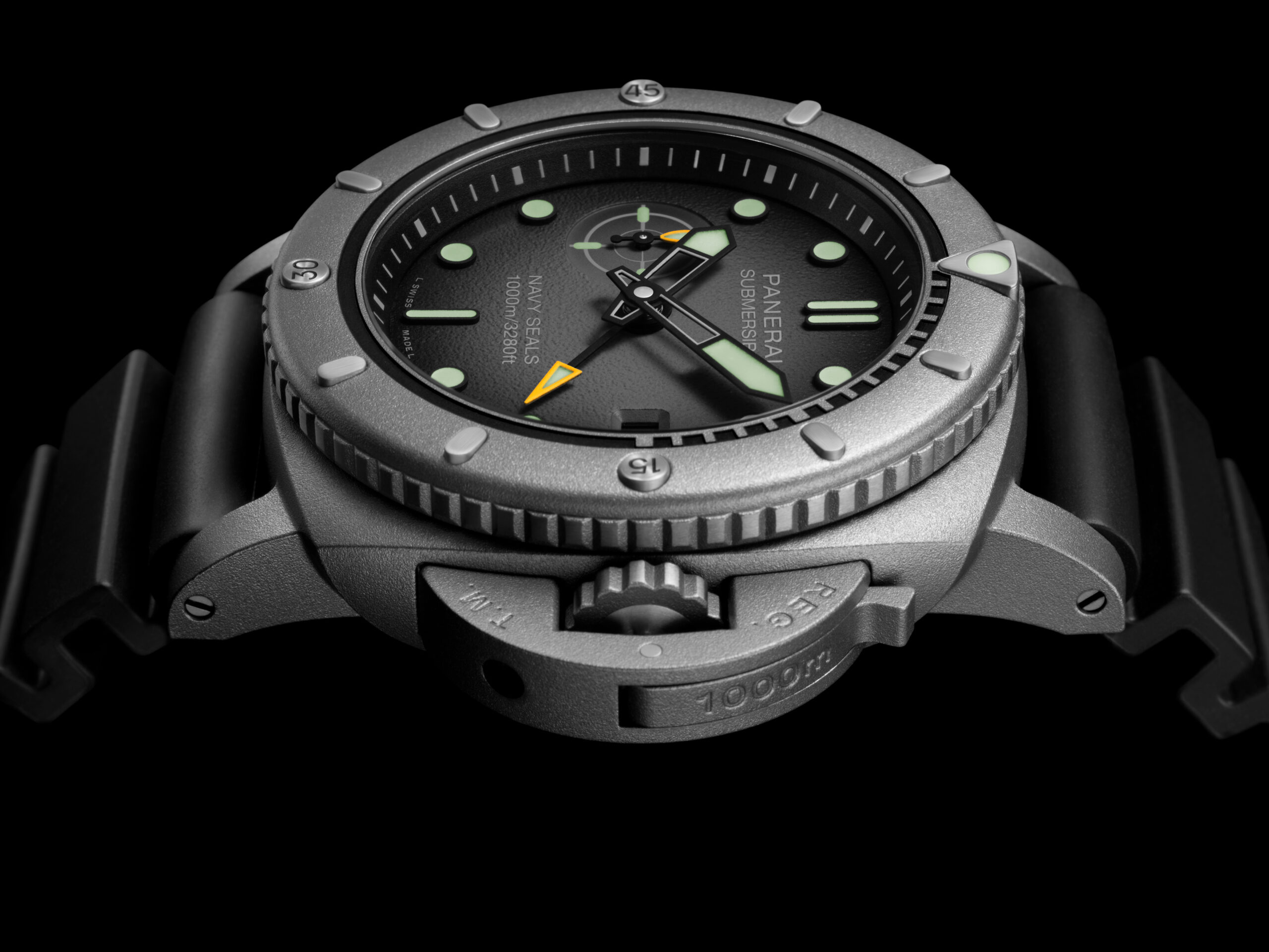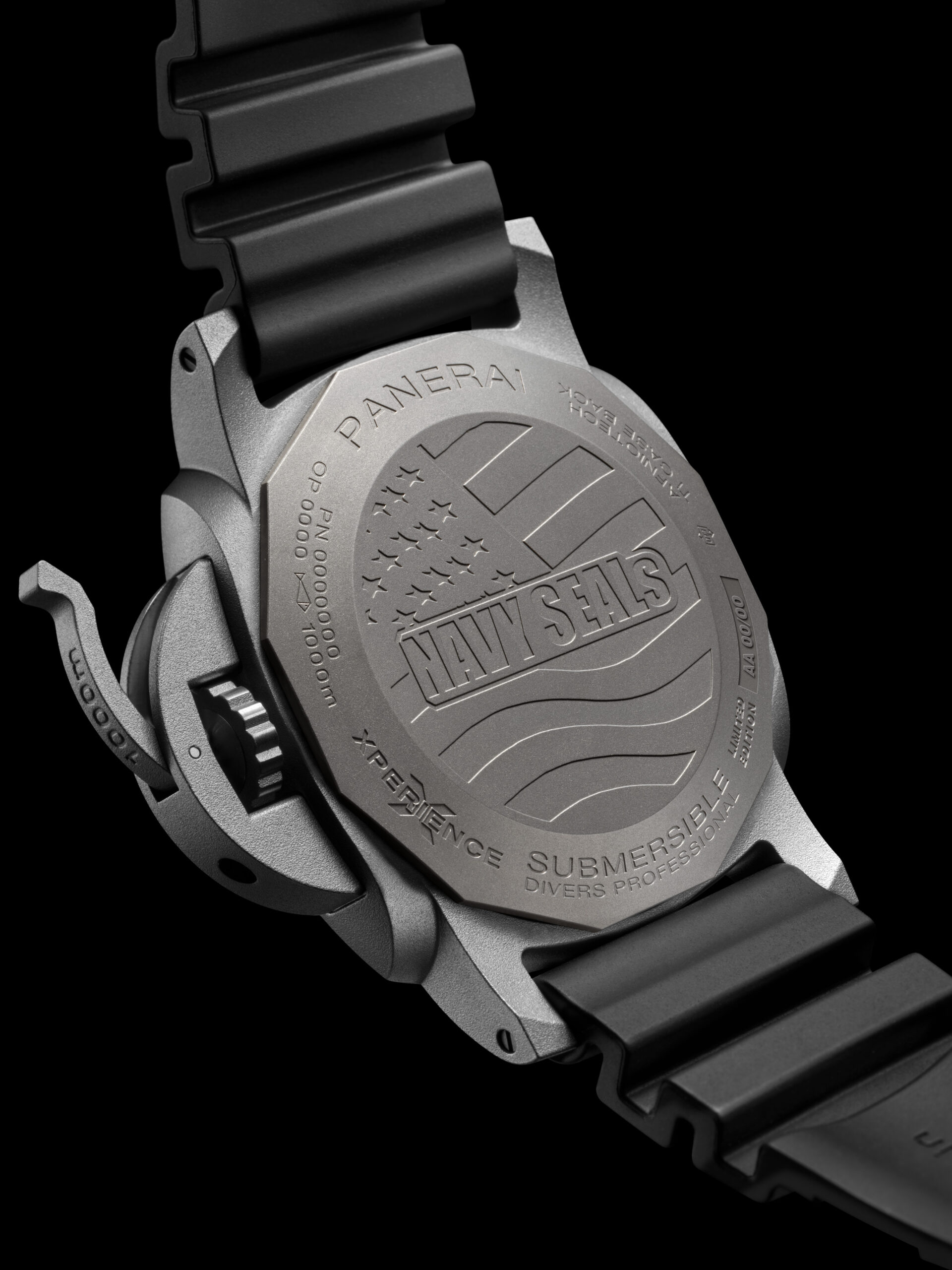 Submersible Navy SEALs Afniotech™ Experience PAM01089, in Afniotech sabbiato, da 47 mm, vetro zaffiro antiriflesso, lunetta girevole unidirezionale zigrinata con indici applicati della scala sessagesimale ogni 5 minuti (scala dei 15 minuti incisa internamente al laser), ponte proteggi-corona a leva, fondello serrato a vite personalizzato con il logo degli U.S. Navy SEALs. Impermeabilità fino a 100 atmosfere. Quadrante antracite fumé, scala della minuteria sul rehaut, indici geometrici applicati e rivestiti di SuperLuminova grado X2, lancette scheletrate a gladio brunite e parzialmente luminescenti, sfera del secondo fuso a punta di freccia luminescente profilata in giallo, datario a finestrella al 3, piccoli secondi al 9 a simulare un bersaglio. Movimento automatico di manifattura, calibro P.9010/GMT, 13 ¾’’’, 6 mm di spessore, 31 rubini, 199 componenti, bilanciere in Glucydur oscillante a 28.800 alternanze/ora, sistema antiurto Incabloc, due bariletti, riserva di carica di 3 giorni. Cinturino in caucciù nero, fibbia ad ardiglione in titanio sabbiato. Edizione limitata a 35 esemplari.