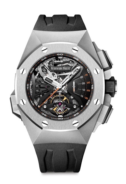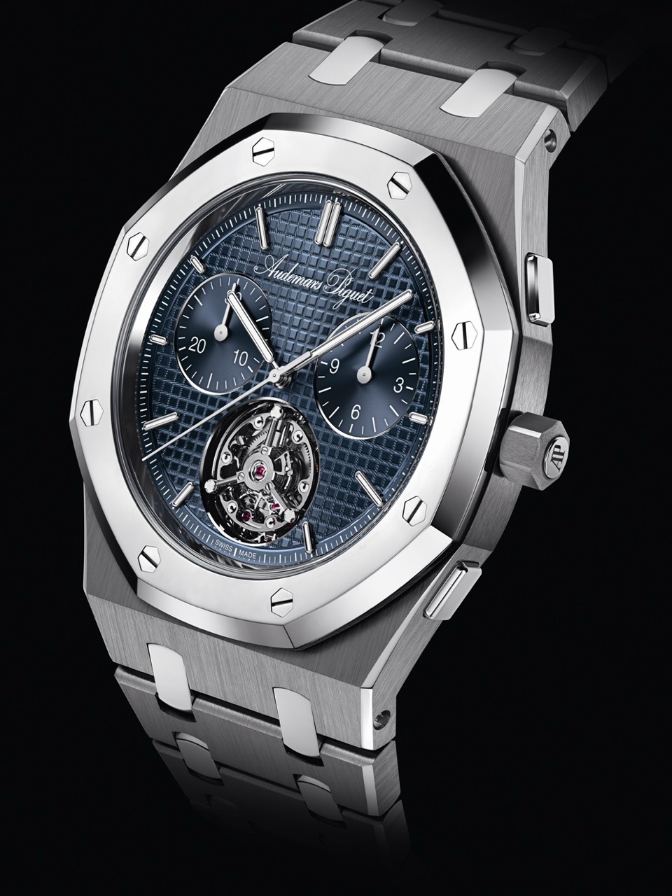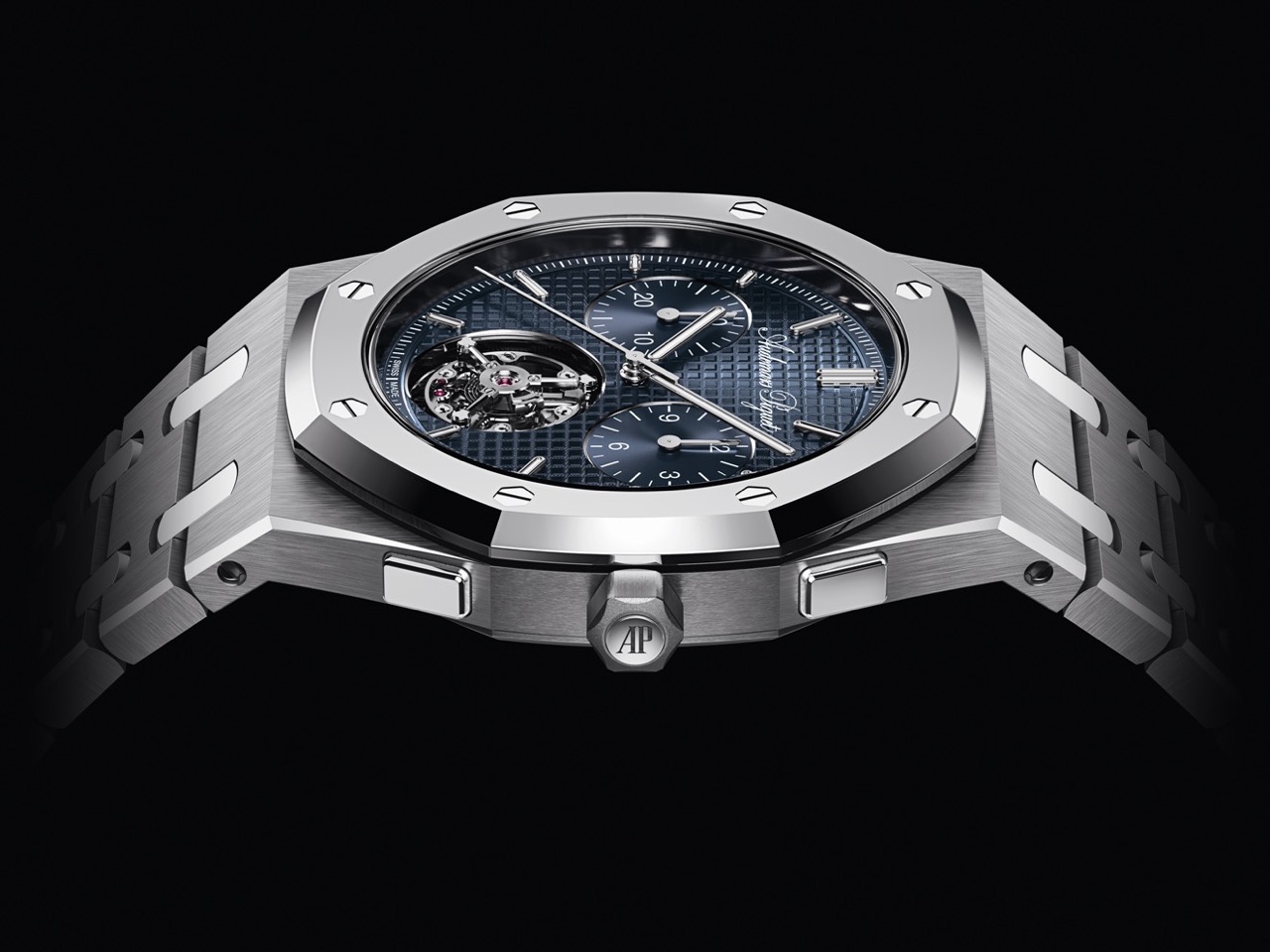 Royal Oak “Jumbo” Flying Tourbillon Cronografo Automatico Extra-Piatto RD#5, in titanio (carrure e corona) e Bulk Metallic Glass (lunetta, pulsanti, fondello e selettore di funzione), da 39 mm (spessore di 8,1 mm), vetro zaffiro antiriflesso, pulsanti di forma, fondello integrato da vetro zaffiro. Impermeabile fino a 2 atmosfere. Quadrante “Bleu Nuit, Nuage 5.0”, Petite Tapisserie, indici “baignoire” in oro rosa rodiati e lancette a bastone in oro bianco luminescenti, tourbillon volante al 6, contatori (ore crono al 3 e minuti crono al 9) con fondo rifinito a colimaçonnage. Movimento automatico di manifattura, calibro 8100, riserva di carica di 72 ore a crono avviato/80 ore a crono fermo. Bracciale in titanio e BMG, chiusura déployante in titanio.
