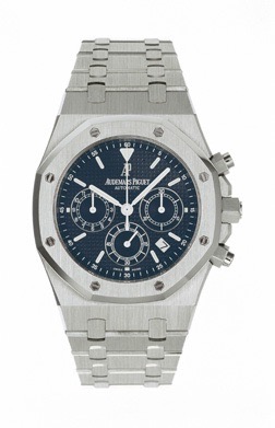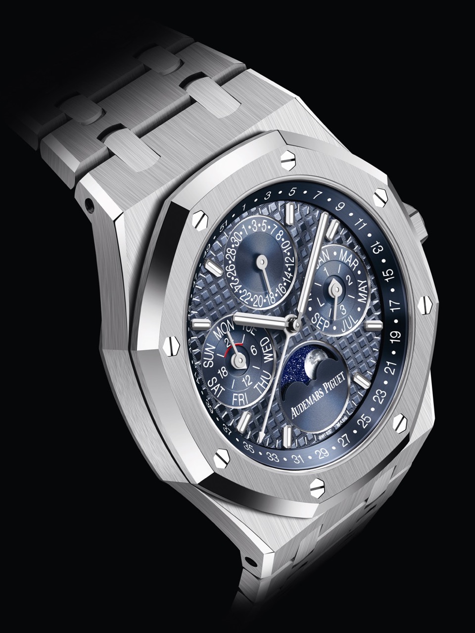 Royal Oak Calendario Perpetuo, in acciaio da 41 mm (spessore di 9,5 mm), vetro zaffiro antiriflesso, fondello integrato da vetro zaffiro. Impermeabile fino a 5 atmosfere. Quadrante blu, Grande Tapisserie, indici a barretta in oro bianco e lancette a bastone in oro bianco luminescenti; indicazioni: mesi e ciclo bisestile al 3, fasi di luna al 6, mesi e 24 ore al 9, data al 12, settimane sul rehaut. Movimento automatico di manifattura, calibro 7138, riserva di carica di 55 ore. Bracciale in acciaio, chiusura déployante in acciaio.