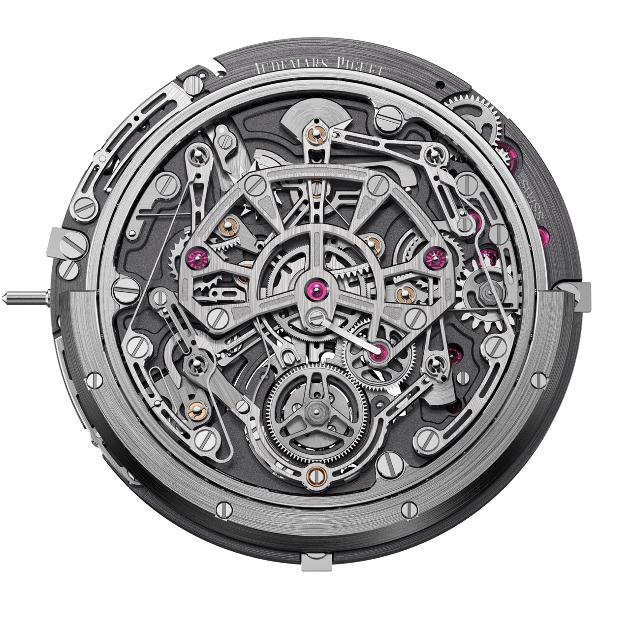 Riguardo l’habillage, per assicurare i 39 mm di diametro ed uno spessore di 8,1 mm, Audemars Piguet ha lavorato alacremente sul contenimento dell’altezza del calibro e, per esaltare la sottigliezza del profilo, ha coniugato la leggerezza del titanio – su carrure e corona – con la resistenza del BMG (Bulk Metallic Glass), su lunetta, fondello, pulsanti e selettore di funzione sulla corona. Costituito per il 61% da palladio, l’esclusivo BMG di Audemars Piguet è una lega metallica, la cui struttura amorfa che si determina dopo un rapido raffreddamento, si contrappone con grande efficacia all’usura e alla corrosione e la finitura a specchio ne esalta la brillantezza. Il connubio materico si ripete sul bracciale, classicamente rastremato e perfettamente integrato a proseguire il taglio angolare delle anse sulla carrure, tra maglie orizzontali in titanio satinato con smussi lucidi (stesse finiture sulla cassa) e raccordi verticali in BMG, eccezionalmente trattato, sul fondello, fissato con otto viti passanti, con una satinatura circolare. Il comfort al polso è stato, poi, elevato all’ennesima potenza, abbinandovi, oltre alla necessaria ergonomia, l’immediatezza nella gestione della funzione cronografica, con soluzioni innovative relative ai pulsanti. Per inciso, ricordiamo che Audemars Piguet presentò i suoi primi cronografi da polso negli anni ’30: prodotti in numero estremamente limitato (solo 307 esemplari prima del 1980), questi segnatempo sono tra i più rari al mondo. Tornando ai pulsanti, in un cronografo tradizionale, questi richiedono solitamente una pressione significativa per essere attivati, come spiega Giulio Papi, Direttore del Watchmaking Design: “La loro corsa, ovvero la distanza che devono percorrere con la pressione, è spesso pari o superiore a 1 mm e richiede una forza di circa 1,5 chilogrammi. Il nostro obiettivo era di ridurre questi valori per migliorare l’esperienza dell’utilizzatore, ispirandoci ai pulsanti degli smartphone, che solitamente hanno una corsa di 0,3 mm e richiedono una forza di 300 grammi”. Va considerato in tal senso che l’introduzione delle guarnizioni impermeabili e l’avvento dell’industrializzazione negli anni ’70, ha comportato che la forza necessaria per azionare i pulsanti del cronografo aumentasse notevolmente. Il lavoro per rendere l’experience del cliente più fluida e naturale è proseguito anche sulla corona, prevedendo un selettore di funzione, costituito da un pulsante coassiale con la stessa, con indicatore visivo a due posizioni: ricarica e impostazione dell’ora. Così facendo, si evita l’operazione di estrazione della corona in posizioni successive che, alla lunga, può stressare il sistema di carica e regolazione. Rimanendo sulla cronografia, ma analizzandone la sua connotazione meccanica, torniamo sul calibro automatico di manifattura AP 8100 – 31,4 mm di diametro (14’’’), spessore di 4 mm, 379 componenti, 44 rubini, bilanciere ad inerzia variabile oscillante a 21.600 alternanze/ora, massa oscillante periferica in platino al fine di limitare lo spessore ed offrire piena visuale sul movimento, riserva di carica di 72 ore a cronografo avviato e di 80 ore a crono fermo -, evidenziando un sostanziale intervento sul dispositivo di azzeramento, tradizionalmente basato sull’interazione tra martelletto e camma a cuore. Audemars Piguet lo ha completamente ripensato, anche in presenza della funzione flyback, ponendosi come obiettivo primario l’ottimizzazione della gestione dell’energia, ottenibile sia sul movimento, sia sfruttando i pulsanti a corsa breve e a bassa forza. Ma andiamo con ordine, premettendo che i suddetti camma a cuore e martelletto sono stati sostituiti da un meccanismo a pignone e cremagliera, “rack and pinion”. Questi entrano in azione contestualmente all’attivazione della funzione cronografica mediante il pulsante al 2, il cui smistamento avviene mediante ruota a colonne (per scelta tecnico-estetica, nascosta tra ponti, leve ed ingranaggi e non visibile come di consueto, quando presente), con innesto verticale: questo, al contrario del dispositivo classico che lo prevede, non avviene a frizione, ma determinando il movimento verticale della ruota dei secondi, limitando attriti e consentendo un risparmio di energia del 10%, contestualmente alla riduzione, pressoché totale, di salti o rotazioni inutili della sfera dei secondi crono. All’avvio della misurazione, la cremagliera scorre sul pignone della ruota dei secondi crono centrale descrivendo un arco di cerchio, al termine del quale viene innescato lo scatto istantaneo dei minuti. Durante questo percorso, la cremagliera “immagazzina” energia e mantiene, nella sua interazione con il suddetto pignone, gli ingranaggi in tensione, impedendo alla lancetta cronografica di vibrare ed eliminando la necessità della molla di accoppiamento presente nei cronografi contemporanei, con funzione di “freno” costante, sia durante il funzionamento sia durante il reset. Dunque, l’energia, in questa fase non viene dispersa ma immagazzinata, grazie ad una molla di flessione e, al momento dell’azzeramento, essa viene rilasciata in modo più fluido e con un’inerzia ridotta, non incidendo sulla riserva di carica, essendo il reset immediato, preciso ed il dispendio di energia minimo.