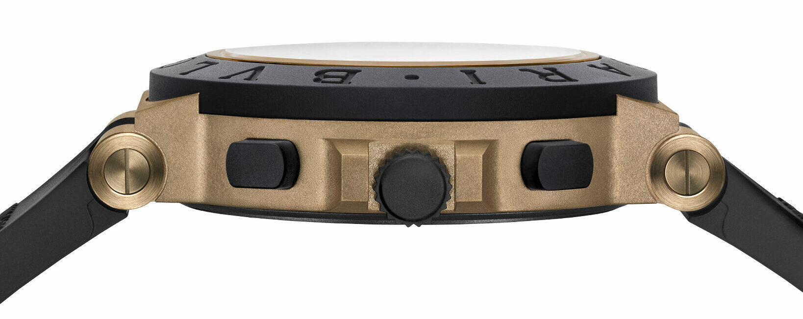 Bulgari Bronzo Chronograph, da 41 mm, in bronzo (spessore di 12,5 mm), lunetta in caucciù incisa “Bvlgari Bvlgari”, vetro zaffiro, corona zigrinata (con spallette di protezione)/pulsanti di forma/fondello in titanio sabbiato DLC nero. Impermeabilità fino a 10 atmosfere. Quadrante nero mat, lancette a bastone luminescenti, indici bianchi a barretta e numero arabo al 12, piccoli secondi al 3, ore crono al 6, minuti crono al 9, scala tachimetrica periferica, datario al 4/5. Calibro automatico B381, riserva di carica di 42 ore. Cinturino in caucciù con raccordi in bronzo, chiusura in velcro.