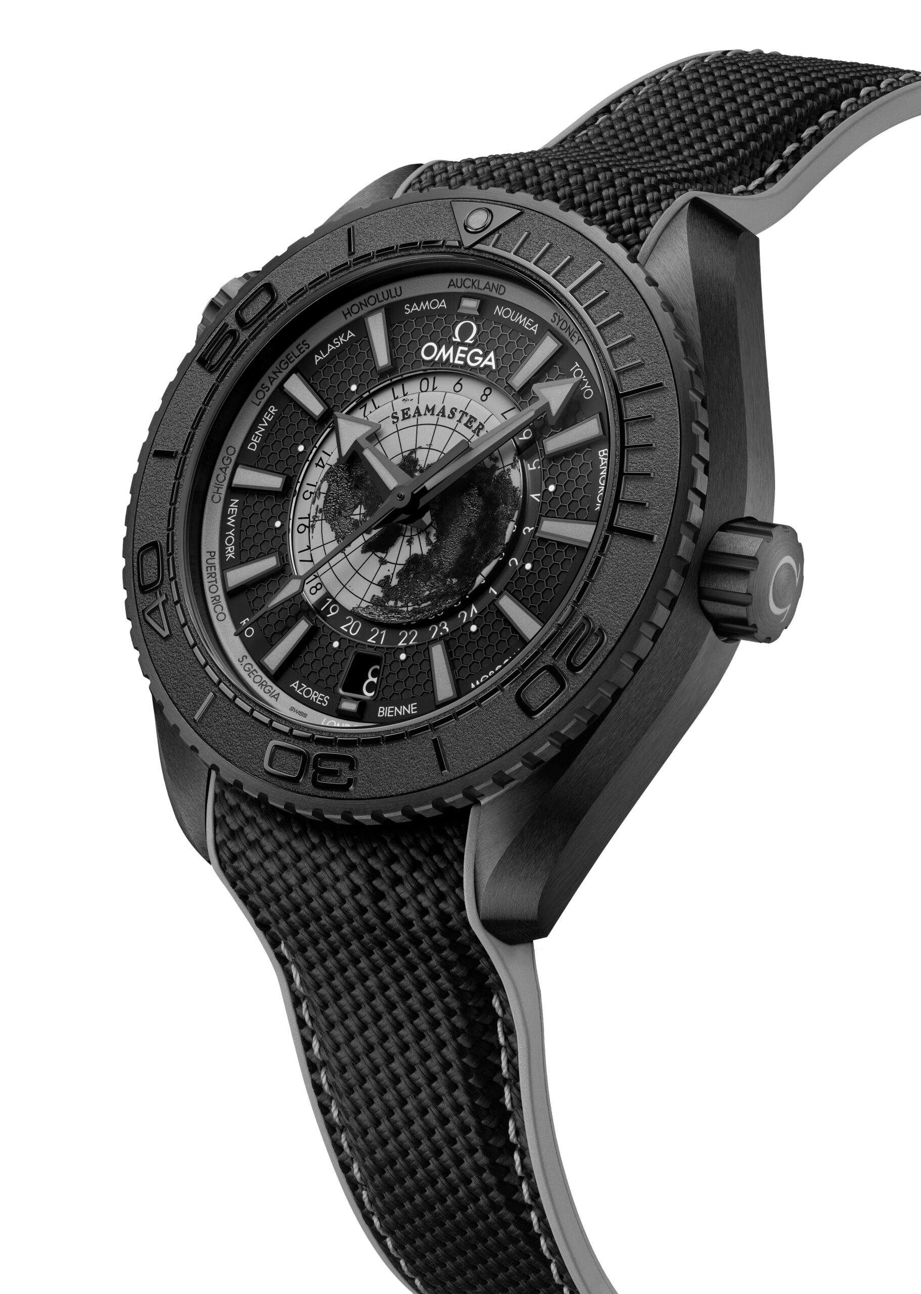 Seamaster Planet Ocean Worldtimer “Deep Black”, da 45,5 mm, in ceramica nera. Impermeabile fino a 600 metri. Impiega il calibro automatico di manifattura Co-Axial Master Chronometer 8938, dotato di 60 ore di autonomia.