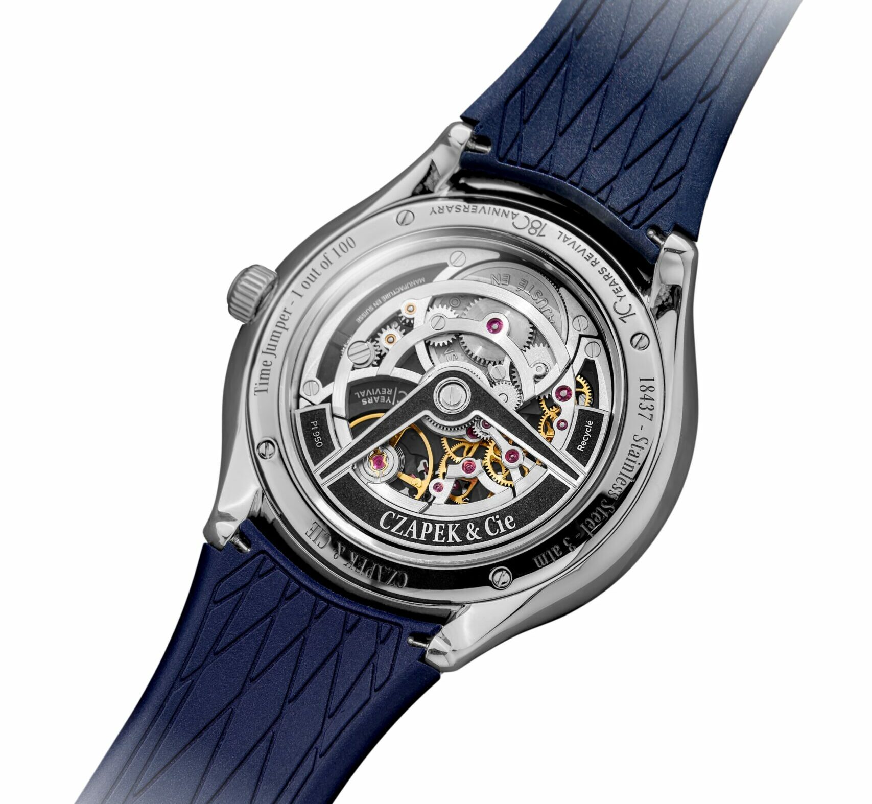 Il Calibro 10.1 non è stato soltanto disegnato, concepito e assemblato internamente, ma anche lavorato al 75% in-house: in ogni caso, Czapek difende la validità e funzionalità del principio dell’”établissage”, ma punta ad una maggiore capacità operativa interna per garantirsi una maggiore agilità e libertà nella filiera produttiva. La Maison produrrà solo 180 esemplari del Calibro 10.1, per omaggiare il 180º anniversario della fondazione, come detto, ed i restanti 50 calibri non utilizzati (130 saranno impiegati per il Time Jumper), verranno destinati a progetti speciali, inclusa una serie di 10 pezzi unici su ordinazione, disponibili contattando direttamente la boutique Czapek. Dotato di cinturino in caucciù blu, il Time Jumper sarà venduto in un packaging a forma di un disco volante, in alluminio con finitura sabbiata e piccoli dettagli lucidi.