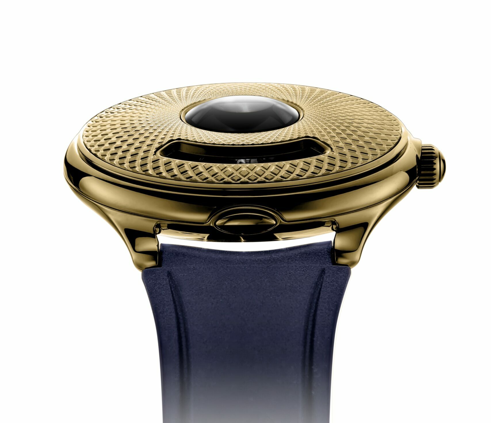 Versione in oro 3N del Time Jumper. Dall’immagine si evince il profilo della cassa a configurare un disco volante. Si può notare la lente a cupola al centro, l’apertura a semicerchio, al 6, per l’indicazione dei minuti e il guillochage della cuvette, il cui motivo, esclusivo di Czapek, si sviluppa “a vortice”, producendo l’illusione ottica di curve risucchiate verso il centro.
