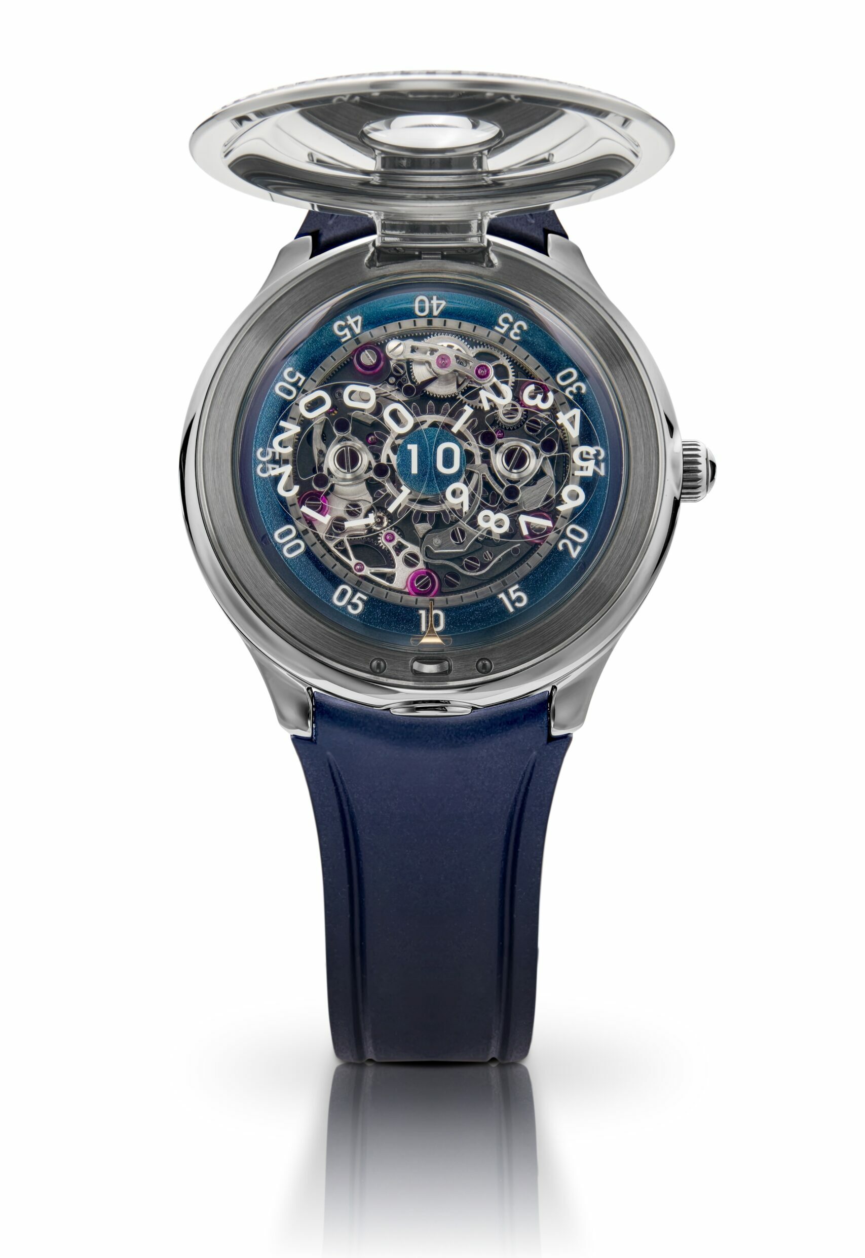 Time Jumper, in acciaio, da 40,5 mm (spessore di 12,35 mm), vetro zaffiro glassbox con trattamento antiriflesso, lunetta lucida, cuvette rifinita con motivo guilloché a vortice (lente a cupola al centro), pulsante al 6 per l’apertura della cuvette, fondello fissato da quattro viti e integrato da vetro zaffiro. Impermeabilità fino a 3 atmosfere. Quadrante a vista, disco delle ore e anello dei minuti colorati al laser in blu e testurizzati. Movimento automatico di manifattura, calibro 10.01, riserva di carica di 60 ore. Cinturino in caucciù blu, fibbia ad ardiglione in acciaio. Serie limitata a 100 esemplari.