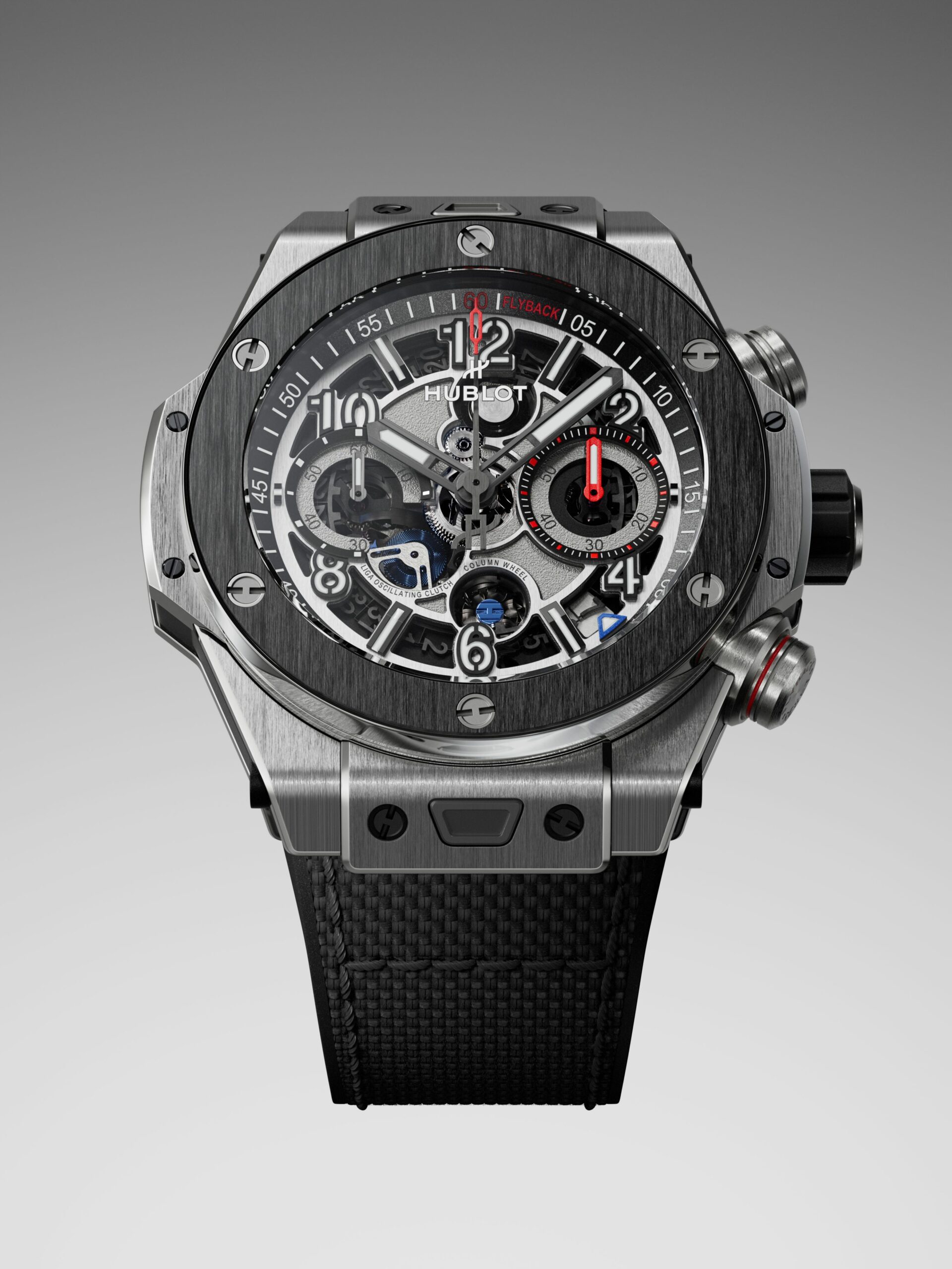 Big Bang Reloaded Titanium Ceramic, in titanio satinato con sfacci lucidi, da 44 mm (14,5 mm di spessore), vetro zaffiro trattato antiriflesso, lunetta in titanio con anello in ceramica nera fissato da sei viti in titanio, pulsanti a pompa, fondello in ceramica nera fissato da sei viti. Impermeabilità fino a 10 atmosfere. Quadrante scheletrato, placcato grigio opaco, indici a barretta e a numeri arabi luminescenti, lancette a bastone brunite e luminescenti, scala dei minuti/secondi sul rehaut, minuti crono al 3, piccoli secondi al 9, ruota a colonne e doppio innesto oscillante a vista, datario a finestrella al 4/5, sfera dei secondi crono con estremità scheletrata in rosso. Movimento automatico di manifattura, calibro UNICO “HUB 1280”, riserva di carica di 72 ore. Cinturino in caucciù nero e tessuto con impunture speciali ad “H”, chiusura déployante in ceramica nera e titanio. Prezzo: 23.500 euro