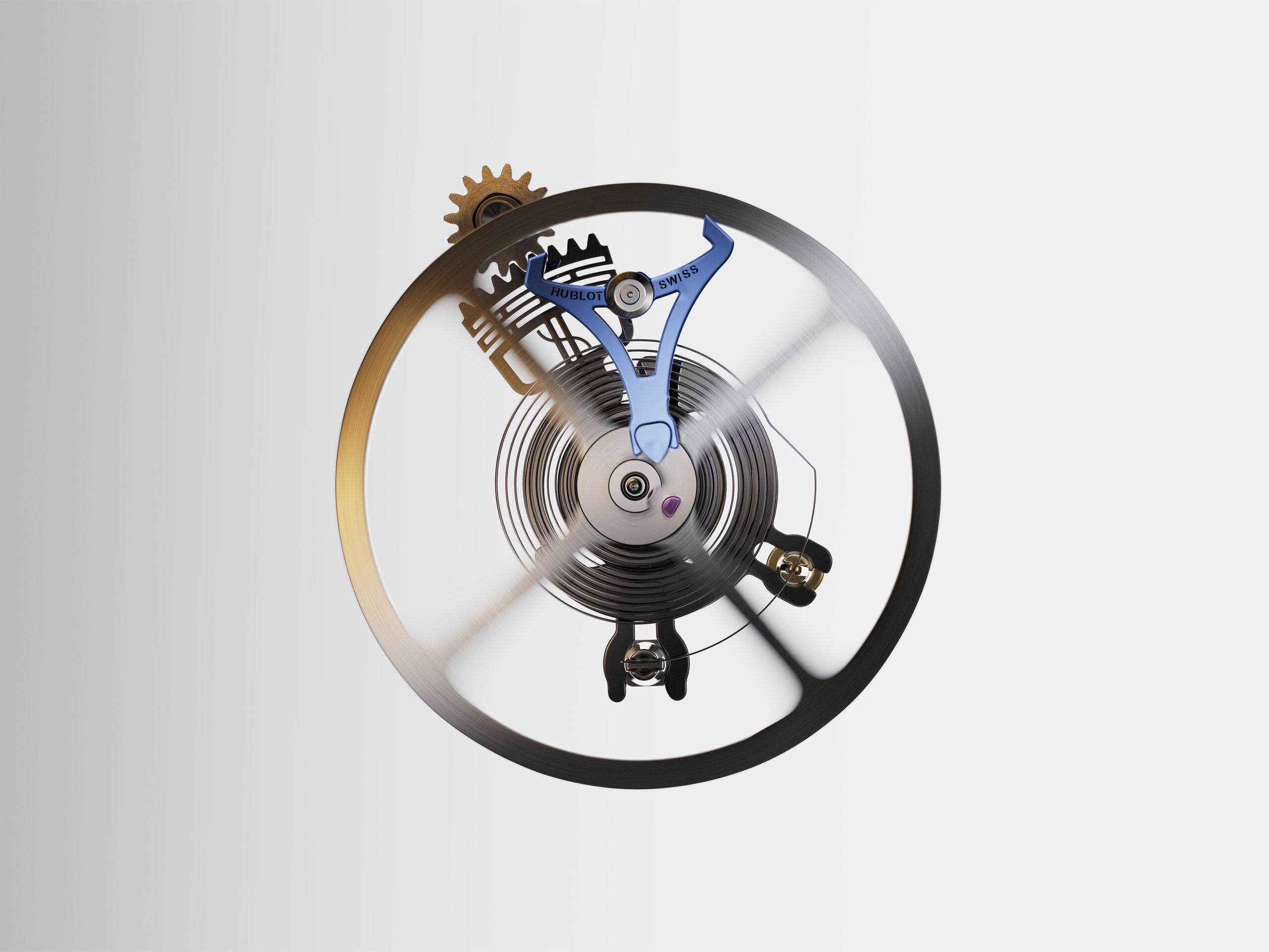 Il bilanciere, con ancora in silicio, dispone di un sistema di regolazione fine eccentrico (piccolo pignone dentato) ad agire sul pitone e sulla lunghezza operativa della spirale.