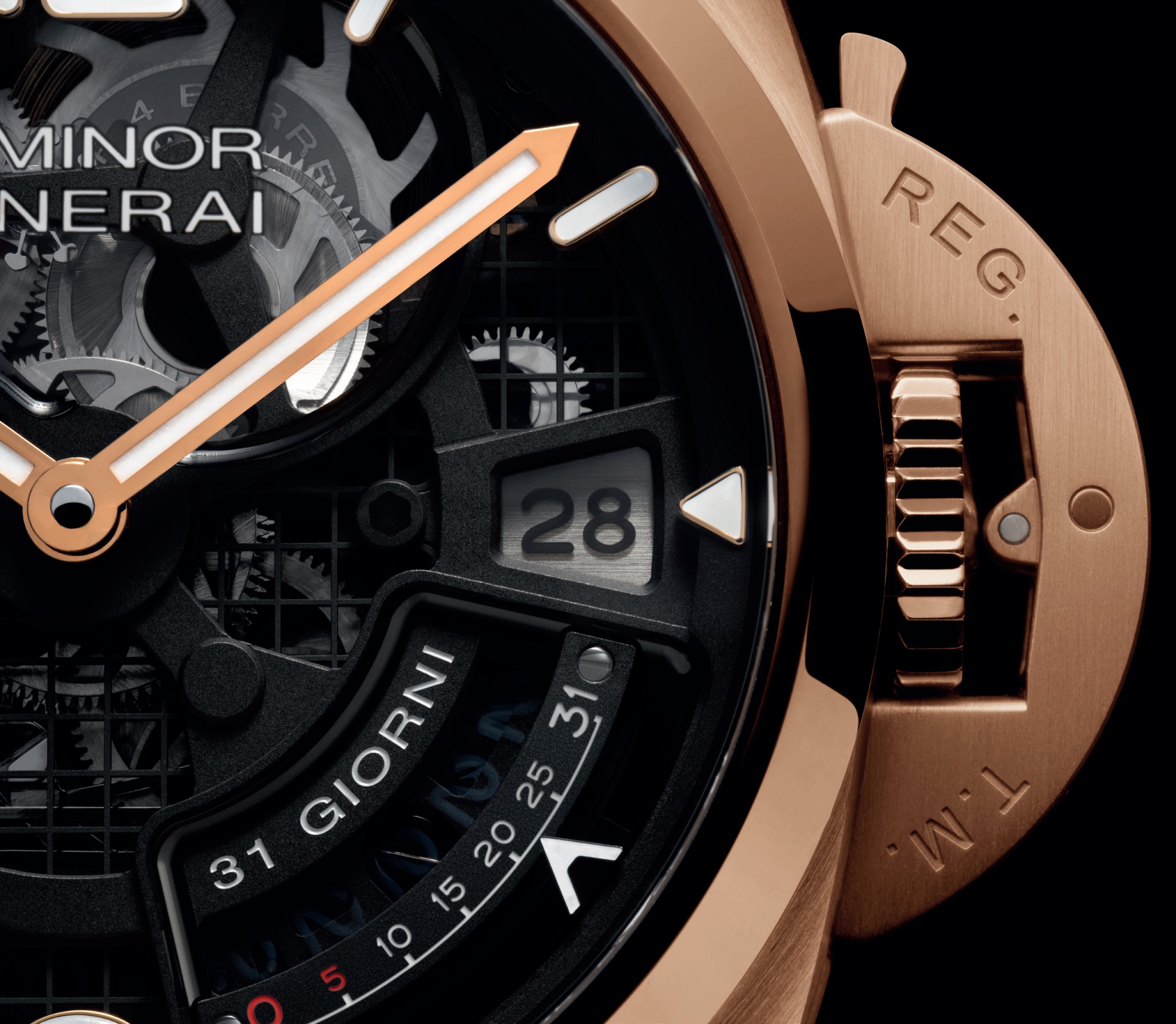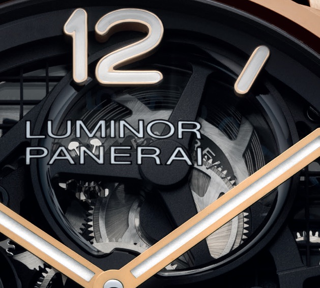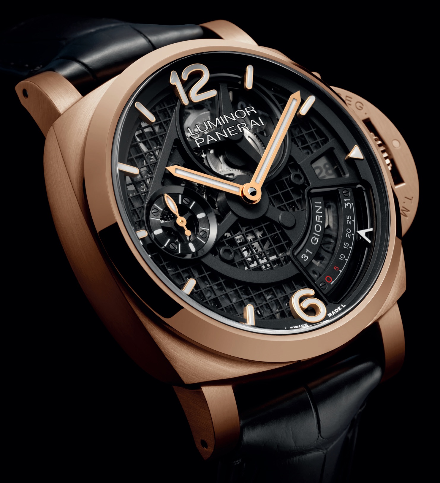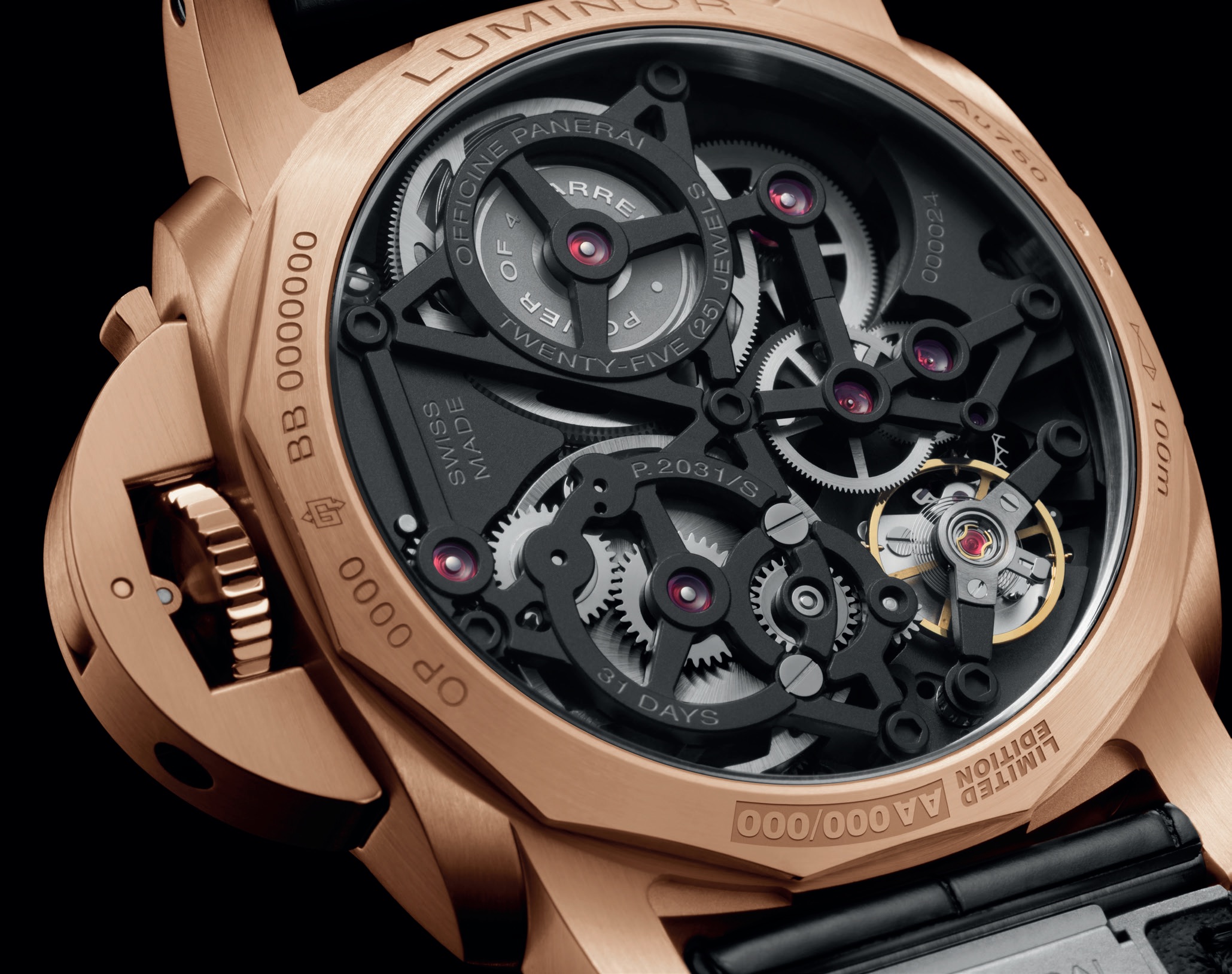 Luminor 31 Giorni “PAM01631, in Panerai Goldtech satinato, da 44 mm, vetro zaffiro antiriflesso, lunetta a spiovente lucida, ponte proteggi-corona a leva, fondello serrato a vite integrato da vetro zaffiro. Impermeabilità fino a 10 atmosfere. Quadrante scheletrato su piano reticolato e ponti bruniti, bariletti al 12, datario polarizzato al 3, indicatore della riserva di carica al 3/6, piccoli secondi al 9, indici a numeri arabi (6 e 12) e a barretta applicati sul rehaut e lancette a bastone dorati e luminescenti. Movimento manuale di manifattura, calibro P.2031/S, riserva di carica di 31 giorni. Cinturino in alligatore nero, fibbia déployante in Panerai Goldtech. Edizione limitata a 200 esemplari.