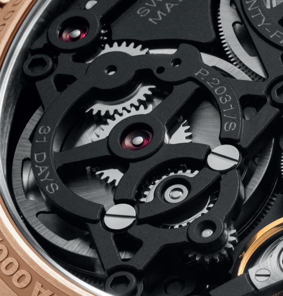 Attraverso il fondello a vite integrato da vetro zaffiro si può visualizzare il calibro manuale di manifattura P.2031/S: 15 3/4’’’, spessore di 10,06 mm, 276 componenti, 25 rubini, bilanciere con viti di compensazione oscillante a 21.600 alternanze/ora, sistema antiurto Incabloc, quattro bariletti in serie (3,3 metri di molle a geometria brevettata), limitatore di coppia, riserva di carica di 31 giorni (744 ore), blocco automatico del movimento. Ponti e platina scheletrati e bruniti.